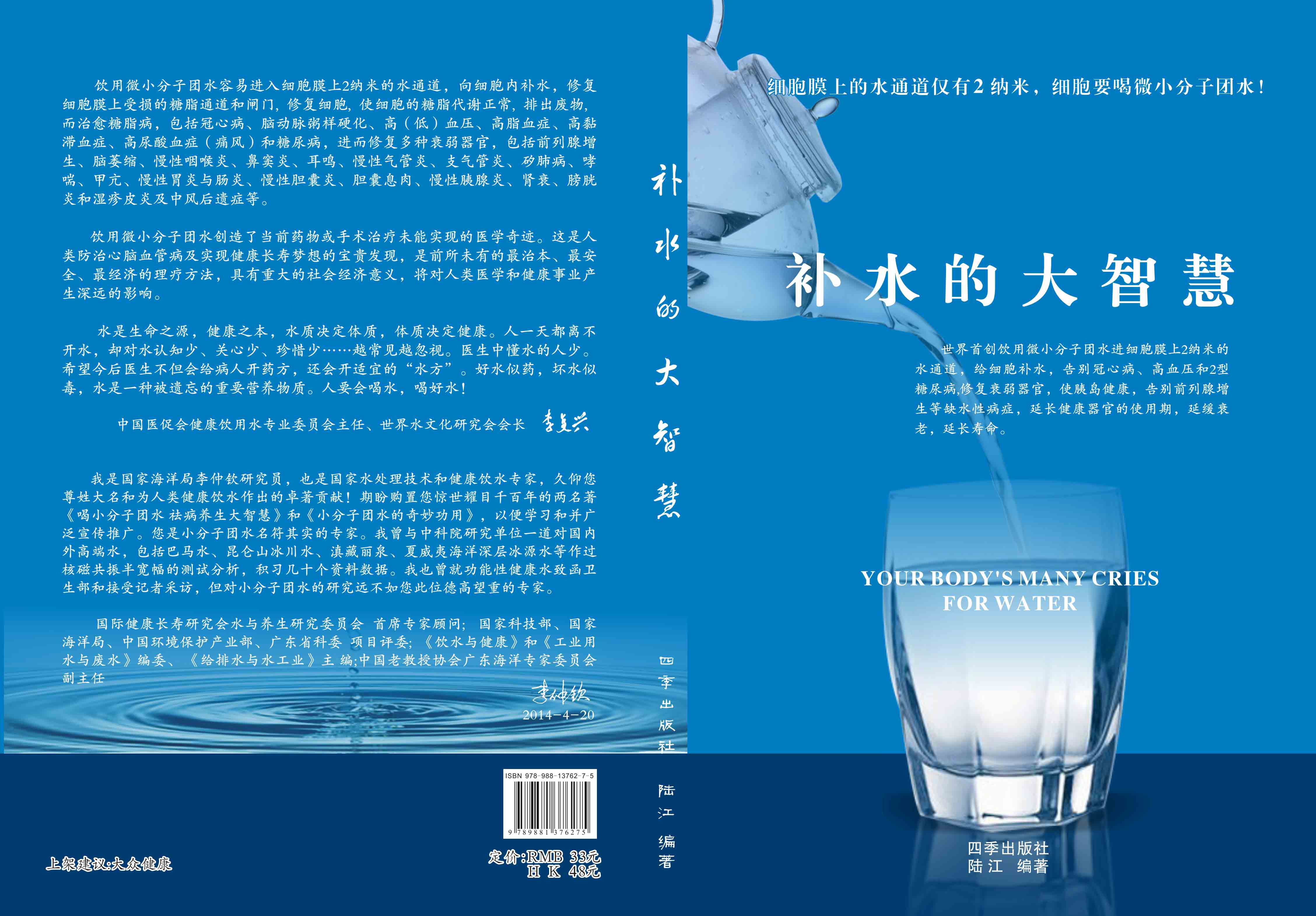 ----幾千年來,人們感到口渴才喝水,誤認為口渴是唯一的缺水信號,使喝水量偏少。很多人只知道補血補氣補腎補鈣補硒,而不知補水,逐漸使許多器官缺水,包括皮膚、動脈、氣管、膽囊、腸胃、骨關節、腎臟、前列腺和胰島缺水,以致患冠心病、高(低)血壓和糖尿病等缺水性病癥。美國F·巴特曼醫學博士寫有《水是最好的藥》一書很受歡迎,我國2007年譯成中文版,論述人體缺水引起許多病癥,他指導3000多患者喝水治愈了哮喘、胃炎和高血壓等病癥。而我是從2000年起,讓患者飲用微小分子團水,因為容易進細胞膜上2納米的水通道,治愈了許多缺水性的病。我跟蹤調查14年,發現凡是認真飲用和合理膳食,可治愈冠心病、高(低)血壓和2型糖尿病與衰弱器官并發癥及中風后遺癥。高血壓患者飲用2~5個月,癥狀消除,不再服藥,逐漸逆轉至消除動脈粥樣硬化,血壓正常穩定,治愈了高血壓;冠心病人飲用3~5個月,消除心絞痛、房顫等癥狀,不再服藥,一年左右心電圖正常,經冠狀動脈造影掃描表明冠脈內無粥樣斑塊,真正治愈了冠心?。?型糖尿病人飲用3~10個月停藥,血糖尿糖正常,糖尿病痊愈。并且使前列腺增生、慢性咽喉炎、鼻竇炎、耳鳴、慢性氣管炎、支氣管炎、哮喘、矽肺病、慢性胃腸炎、膽囊炎、胰腺炎、腎衰、膀胱炎、風濕性關節炎、便秘、痔瘡和濕疹皮炎等不藥而愈,而無需終生服藥。飲用微小分子團水治愈的是長期吃藥治不好的病,彌補了幾千年來醫藥的欠缺,成為人類健康的寶貴資源。